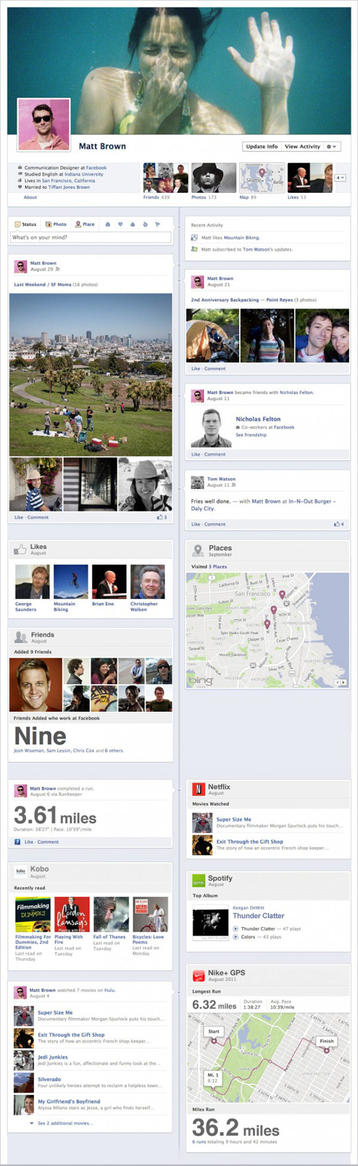 Timeline è decisamente il termine migliore per riassumere tutte le peculiarità del nuovo layout: si tratta infatti di una decisa virata verso un’impostazione da loro definita “strorytelling” ovvero una precisa gestione cronologica del proprio spazio e delle proprie attività. Una headline personalizzabile conferisce un aspetto più ufficiale e piacevole alla parte alta della pagina: sotto di essa il consueto spazio bianco viene diviso verticalmente e simmetricamente in 2 metà dalla linea del tempo. Ai due lati di essa sono poste le attività del soggetto in modo da poter identificare con facilità cosa abbiamo fatto, scritto, mangiato, visto, visitato, pensato nel corso della giornata, settimana, mese, anno. Assieme ai nostri post compariranno anche gli aggiornamenti degli amici: desta qualche perplessità la giustapposizione casuale riguardo la paternità degli interventivisto che i nostri e quelli degli altri compaiono indifferentemente sui due lati della timeline. I filtri per gestire la nostra presenza sulle bacheche altrui consentono di utilizzare una sezione Ticker dove riportare contenuti senza che essi debbano necessariamente “sporcare” altre bacheche.  Per far capire quante cose in più Facebook voglia sapere da noi basta vedere quali nuovi campi ha previsto per la suddivisione delle attività: Lavoro ed Educazione, Famiglia e Relazioni, Living, Salute e Wellness, Pietre Miliari ed Esperienze, tutti con ulteriori sottocampi che possono portare alla condivisione totale di tutto ciò che abbiamo vissuto.