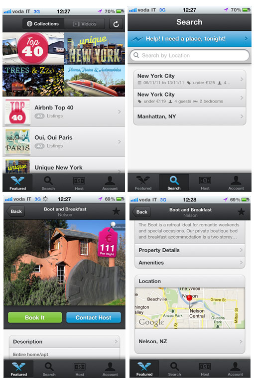Airbnb lavora mettendo in contatto le persone che hanno uno spazio da affittare e quelle che cercano un posto dove stare. A differenza di Booking non tratta strutture alberghiere vere e proprie. L’applicazione è molto funzionale e notevole anche dal punto di vista grafico. Intuitiva e molto user-friendly, Airbnb si articola essenzialmente in 9 punti chiave: la ricerca del pernottamento, la ricerca della disponibilità nelle vicinanza, la consultazione delle proprietà di Airbnb, i dettagli dell’alloggio e la mappa per il raggiungimento, le offerte, i profili degli utenti, la messaggistica per contattare i padroni di casa, la prenotazione con carta di credito.