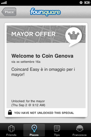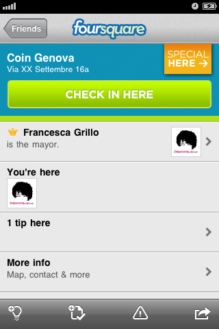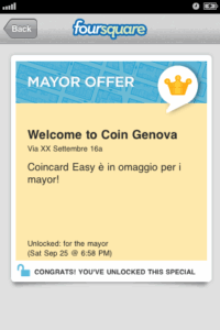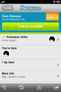 Ho scoperto della promozione effettuando un check-in in zona Coin Genova. Foursquare mi ha avvisato che nei dintorni c’era una promozione attiva per i mayor. Le mie visite sporadiche si sono trasformate in un appuntamento più costante: con l’occasione del check-in, ci è anche scappato qualche acquisto in più! Condividendo i miei continui check-in ho reso evidente ai miei contatti che qualcosa di speciale stava avvenendo alla Coin di Genova. Così è iniziata una piccola battaglia con amici e altri utenti di Foursquare.